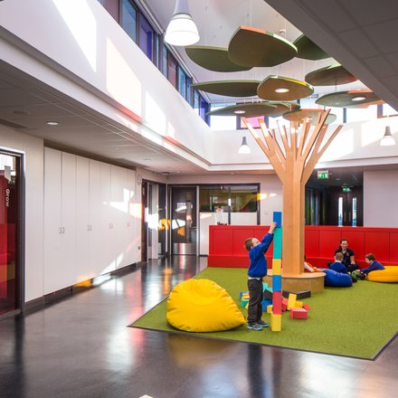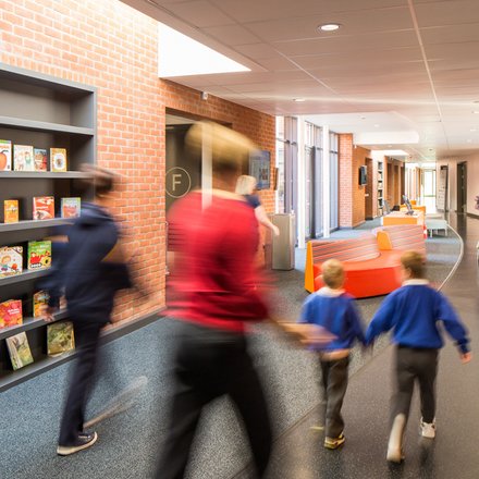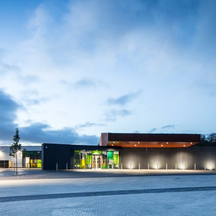 Arvalee School caters for 120 pupils, aged 3–19, with a range of moderate to complex educational needs. I+E’s design concept for Arvalee was conceived within our overall Exemplar Design for Strule Shared Education Campus and was subsequently developed & delivered as Phase 1 of the Campus. Classrooms for each Key Stage 1–4, are grouped in pods around top–lit Resource Areas. Each connects directly to the shared bank of facilities at one end & open onto external/covered play areas at the other. Arvalee’s SMT enthusiastically embraced the I+E concept, defining each Pod with a specific learning experience, to Explore, Inspire, Perform & Create “EIPC” with each one individually branded to further enhance pupils’ experience & assist in wayfinding. Arvalee has been developed to BREEAM excellent with high thermal fabric, PV and solar water roof panels, SUDS and rainwater harvesting systems.